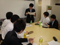 今年入社の社員と去年入社の社員との合同会議です。まずは、みんなの前で現状報告。さすがに1年先輩のみんなは、話し方が上手でした。